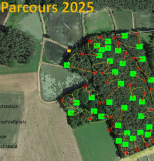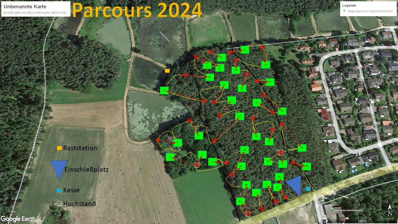 Im Waldstück gegenüber des SC Oberreichenbach ist der Eingang zum Parcours. Parkmöglichkeiten sind reichlich vorhanden.Unser Gelände umfasst ca. 2 Hektar Waldfläche und ist von Karpfenteichen umgeben. Compound, Armbrust, Blasrohr oder Zwillen sind bei uns nicht gestattet. Unser Parcours besteht derzeit aus 28 Stationen mit 36 Tieren. Wir sorgen ständig für Abwechslung an den Stationen und kümmern uns um den „Spielplatz“. Am Waldeingang steht unser Kassenhaus, sowie der Schuhputzer. Im Kassenhaus: Nutzungsbedingungen,Parcoursplan und Briefumschläge. Wenn ihr das Pult aufklappt, findet ihr den Anmeldeordner für Gastschützen. Das Formular bitte vollständig und leserlich ausfüllen. Den großen Zettel im Ordner belassen und den kleinen Abschnitt abtrennen und mitnehmen. Auf einen Briefumschlag die Kontrollnummer des vorher ausgefüllten Formulars schreiben, Entgelt ins Kuvert stecken und ab damit in den Tresor. Ein weiterer Service für unsere Gäste: Auf der Rückseite des Kassenhauses gibt es eine „Fundpfeil-Abholbox“.Wir verzichten komplett auf Schusszettel, um die Umwelt - zumindest ein kleines Stück zu entlasten. Stattdessen setzen wir auf die App 3D Score Buddy. Diese ist für Androidgeräte im Playstore erhältlich. In der kostenlosen Version ist unser Parcours komplett ohne einschränkungen freigeschaltet. Der Weg zu den einzelnen Stationen wird durch pinkfarbene Holzpfeile gekennzeichnet. Das bringt euch sicher durch den Parcours. Manchen mögen sich über die gelb/pinken Bänder und Hölzer an den Bäumen bei den einzelnen Zielen wundern…hängt doch einfach mal euer Sportgerät beim Pfeilziehen/suchen daran und schon macht es Sinn. Festes Schuhwerk sollte vorhanden sein. Von einfach bis herausfordernd ist sicherlich für jeden etwas dabei. Der Abschuss ist mit folgendem Pflock gekennzeichnet. ROT mit Stationsnummer = erfahrene Schützen. Sollte der rote Pflock für Neulinge/Anfänger zu weit/schwer sein, kann (in einer geraden Linie) zwischen Pflock und Ziel der Abstand verkürzt werden. Den Hinweisschildern an Abschusspflöcken ist unbedingt Folge zu leisten. Viel Spaß und alle ins Kill…